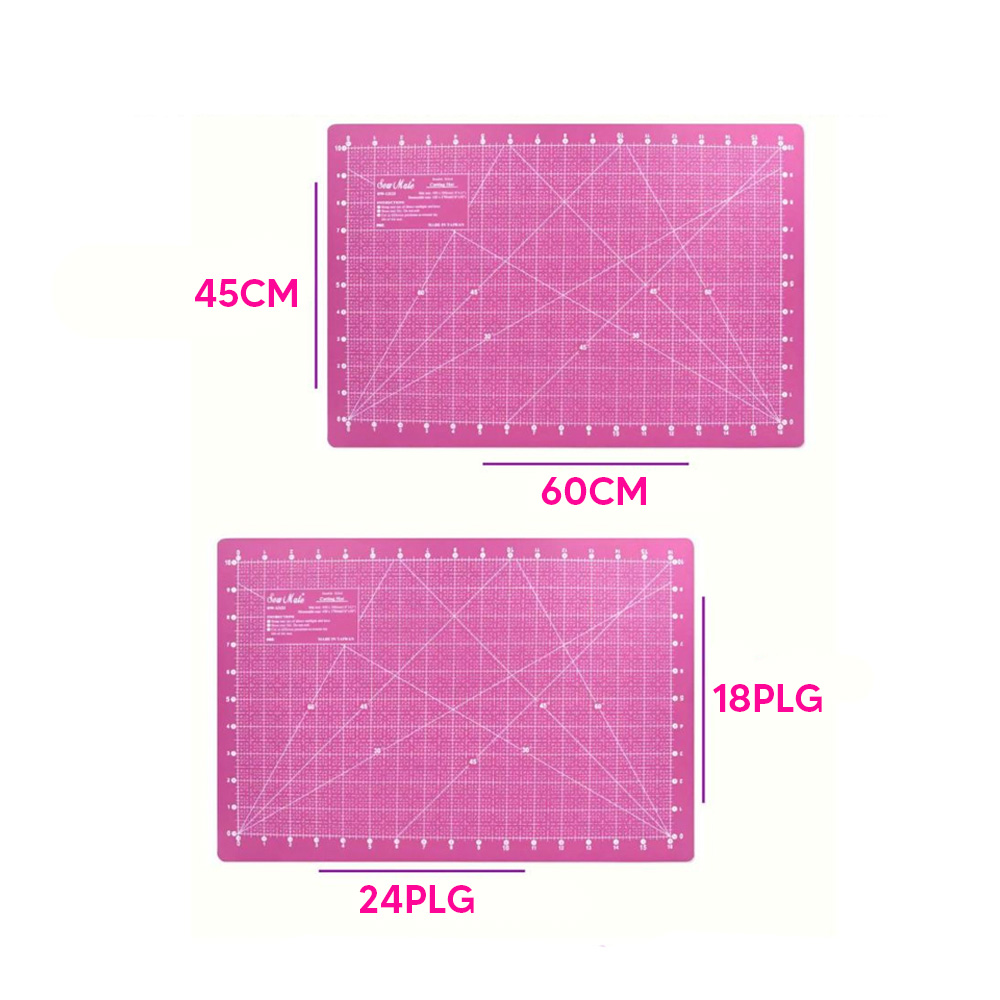 La base de corte esta en cm por un lado y pulgadas por el revés, mide 45×60 cm y 24×18 pulgadas, de color rosado, estan indicados los grados, trae 5 capas, tiene 3 mm de grosor, protege la superficie de corte y proporciona un lugar de trabajo apto para cualquier proyecto de patchwork que realices. Excelente calidad.