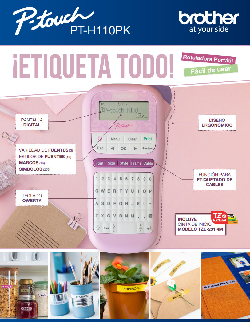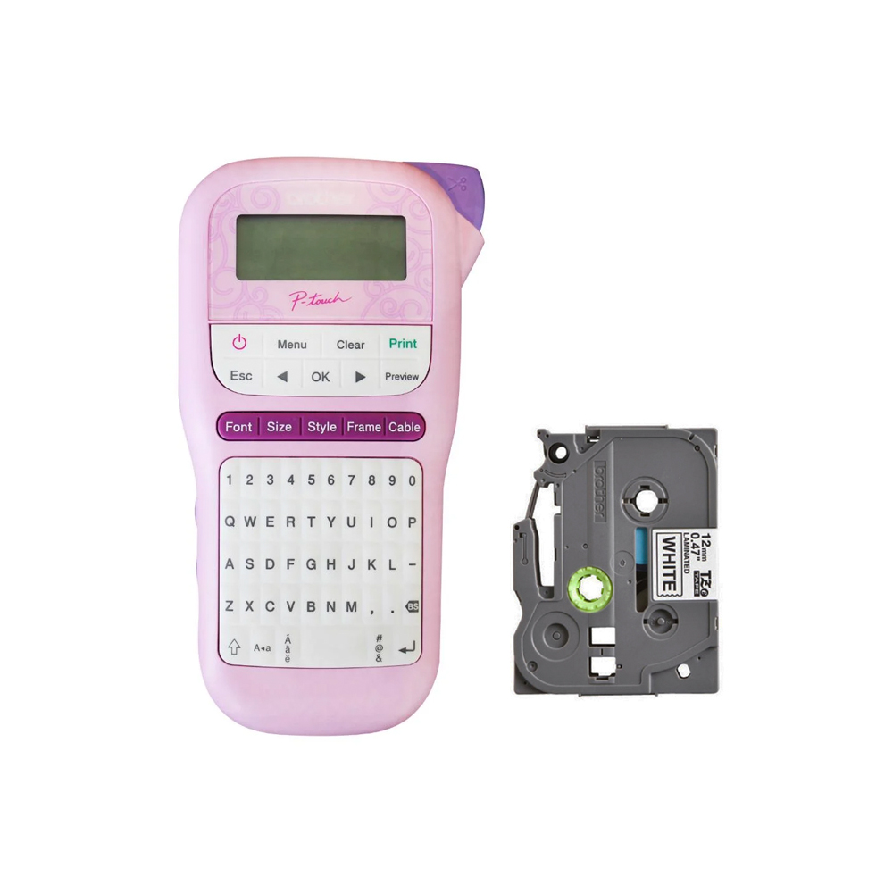 Kit Rotuladora Brother PTH110PK color rosada +TZe 231 negro sobre cinta blanca 12mm x 8mt original Brother